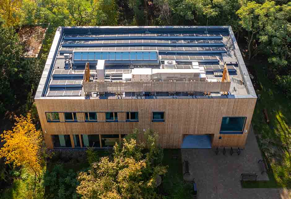 Holz als dominierendes Baumaterial ermöglichte den vollständigen Verzicht auf chemische Imprägnierungen. Auch im Innenraum kamen ausschließlich erneuerbare und recycelte Materialien zum Einsatz – darunter aufgearbeitetes Linoleum und sorgfältig restauriertes Mobiliar. Ein innovatives Heizsystem wurde mit Photovoltaikmodulen kombiniert und liefert zusätzliche erneuerbare Energie – ein klares Bekenntnis zur Umweltfreundlichkeit des Gebäudes.
