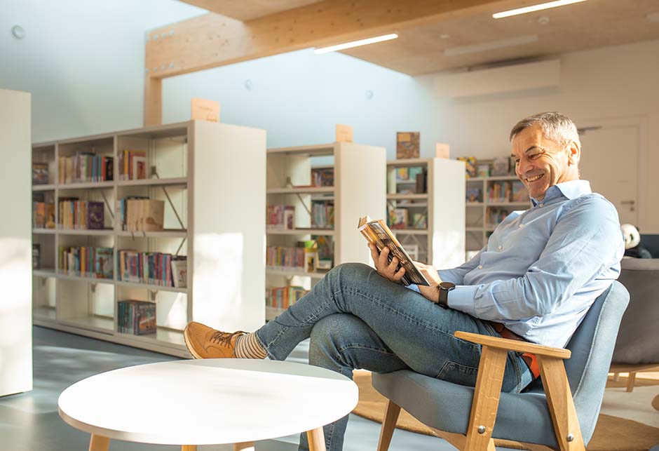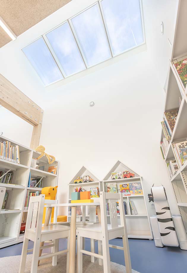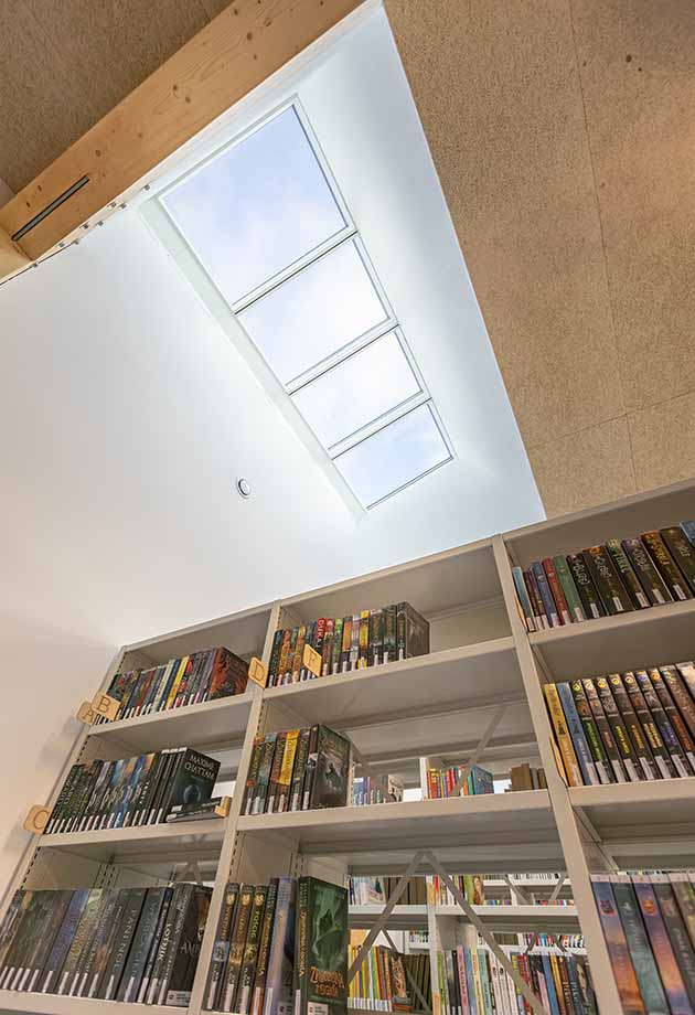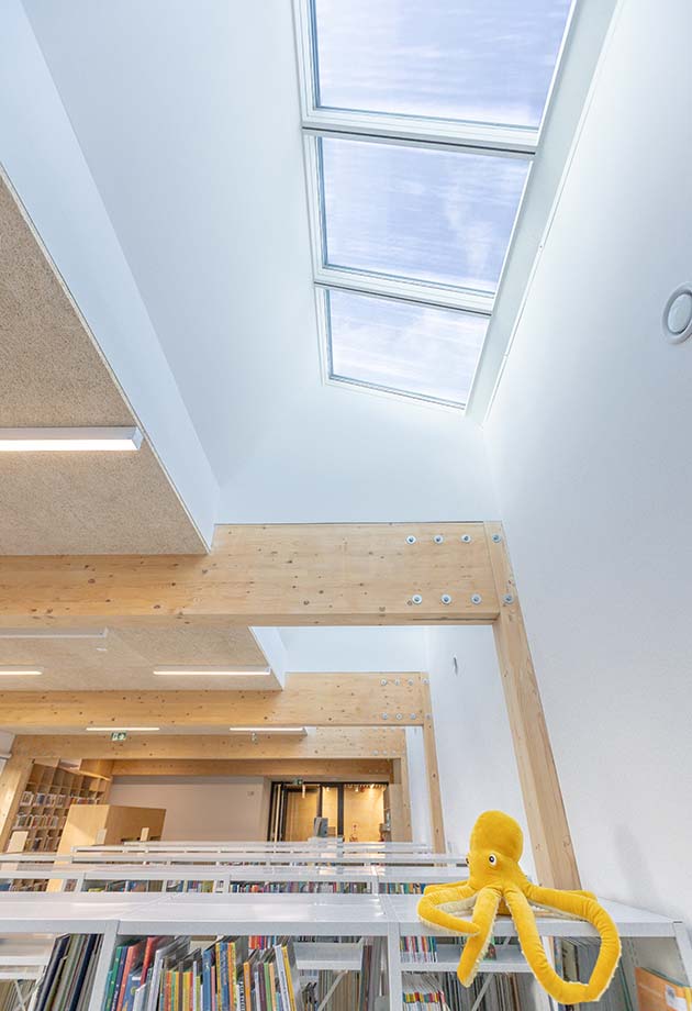 Um möglichst viel Tageslicht in die Innenräume zu bringen, wurde ein aus 12 Modular Skylights Modulen bestehendes Lichtband installiert – darunter zwei Elemente für die tägliche Lüftung. Die Oberlichter befinden sich im Bereich der Kinderbibliothek und sorgen dort für eine konstante Versorgung mit frischer Luft und natürlichem Licht. So entsteht eine helle, freundliche Atmosphäre, die zum Lesen, Spielen und Entspannen einlädt – und den Raum für die jüngsten Nutzerinnen und Nutzer lebendig macht.