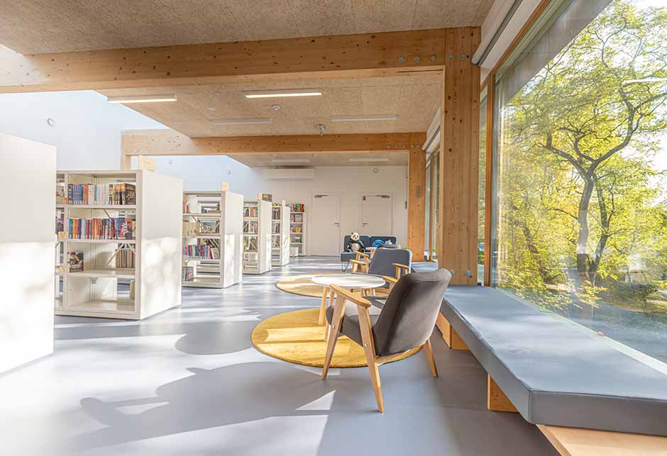 Die offenen, freundlichen Innenräume mit flexibler Raumstruktur bieten Raum für vielfältige Aktivitäten – von Workshops und Veranstaltungen bis hin zu konzentrierter Einzelarbeit. Damit setzt die Bibliothek ein starkes Zeichen für nachhaltige Bauweise und zukunftsorientierte Bildungsarchitektur.
